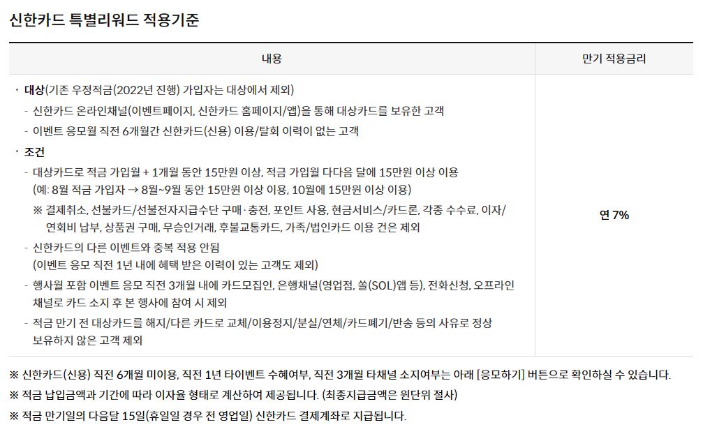 단, 기존 2022년 우정적금 가입자는 해당 혜택의 대상에서 제외되니 참고하시고 또한, 대상카드를 보유한 고객이면서 직전 6개월간 신한카드를 이용하거나 탈퇴한 이력이 없는 고객에 한정된 혜택입니다.