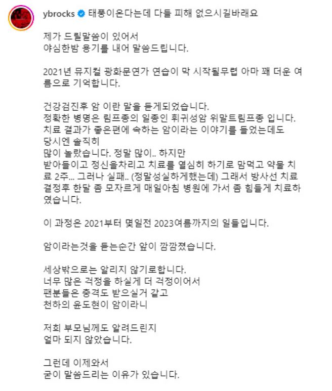 10일 윤도현은 갑작스럽게 자신의 SNS를 통해 "드릴 말씀이 있어서 오랜 고민 끝에 이렇게 알리게 되었습니다"라며 "2021년 뮤지컬 '광화문연가' 연습 중 건강검진을 받다가 암 진단을 받게 되었습니다"라고 밝혔다.