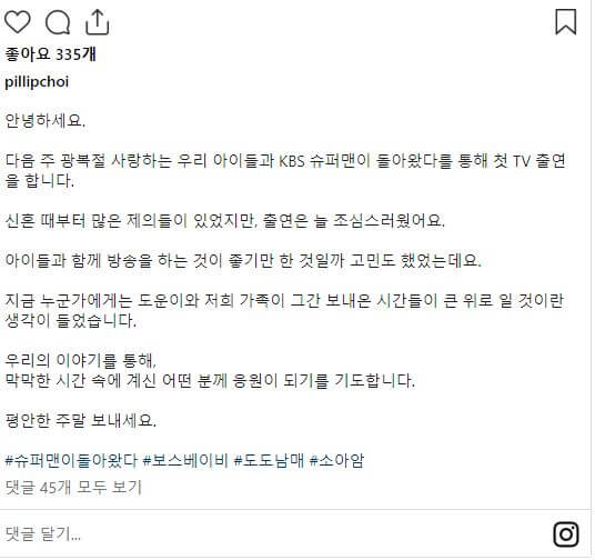 최필립은 오는 15일 방송되는 예고편 영상과 함께 "다음 주 광복절 사랑하는 우리 아이들과 KBS 슈퍼맨이 돌아왔다를 통해 첫 TV 출연한다"라고 말문을 열었습니다.